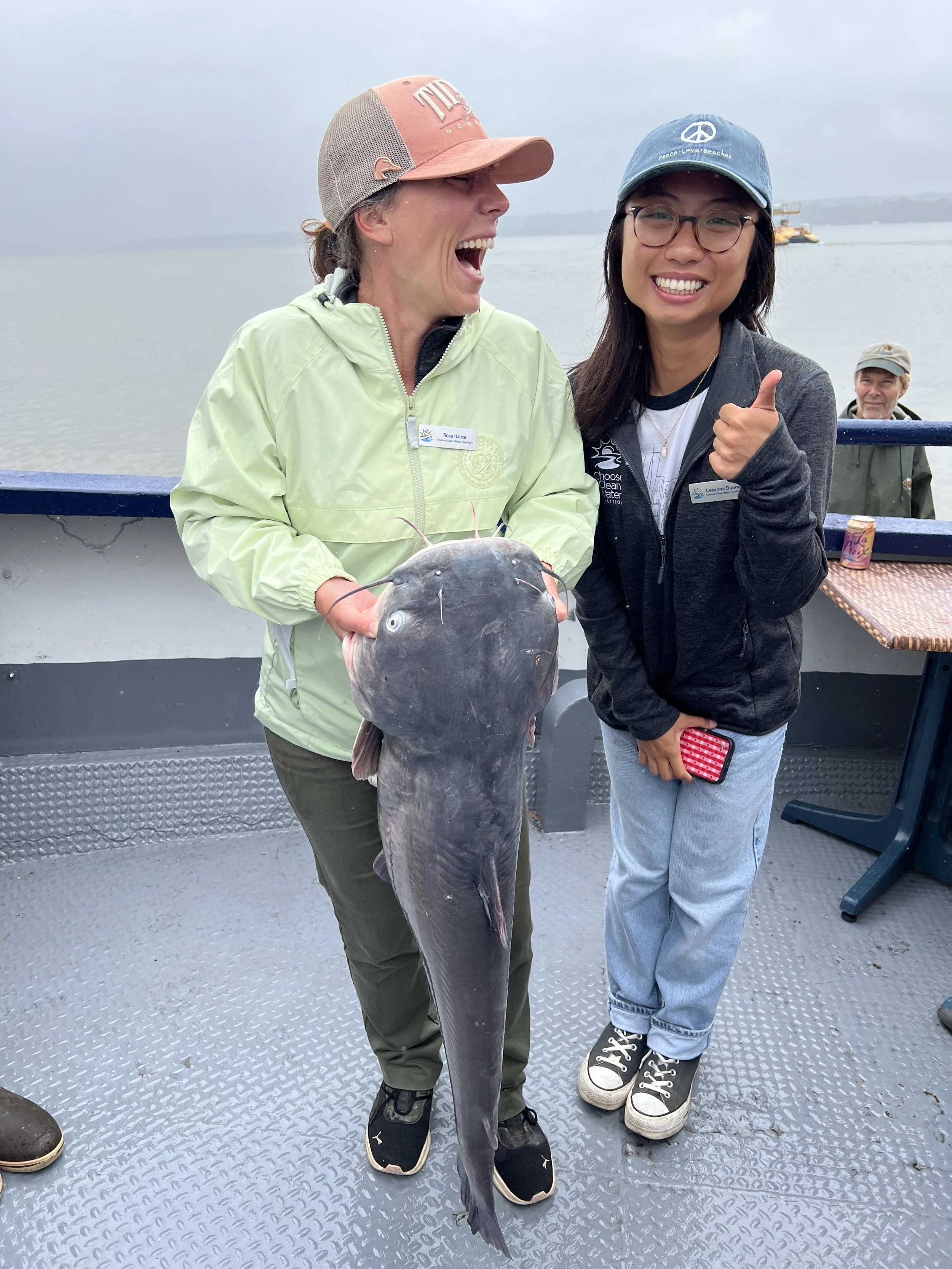 But we didn’t let the weather get to us—our Steering Committee, friends of the Coalition, and staff hopped on the boat ready to set sail on the Potomac River. We had the amazing opportunity to see a live catfish shocking demonstration led by Maryland Department of Natural Resources and United States Geological Survey. We learned about the importance of harvesting these invasive catfish not only to protect the health of the Bay, but to collect data on these apex predators.