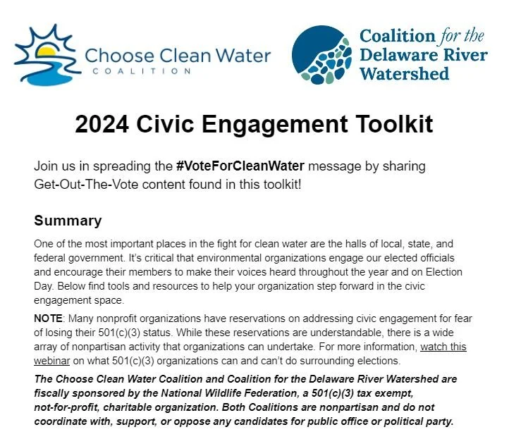 It’s challenging to know where to start to get your organization involved in critical civic engagement efforts. To help, the Choose Clean Water Coalition teamed up with the Coalition for the Delaware River Watershed to launch a comprehensive toolkit. This contains voting deadlines, suggested social media posts, graphics, example emails, and more. Use this toolkit or come up with your own language to ask your supporters to check their voter registration status, send them information on vote-by-mail, or even simply remind them of voter registration deadlines. When you send out your email or post, make sure to use the hashtag #VoteForCleanWater!